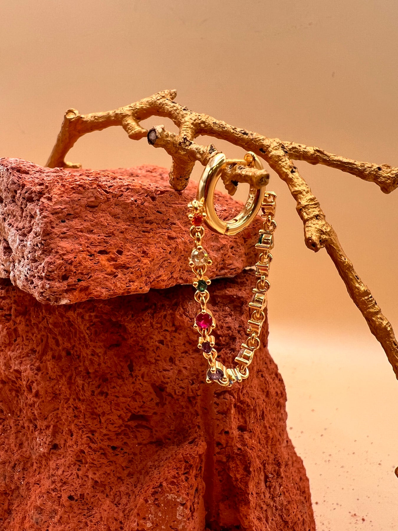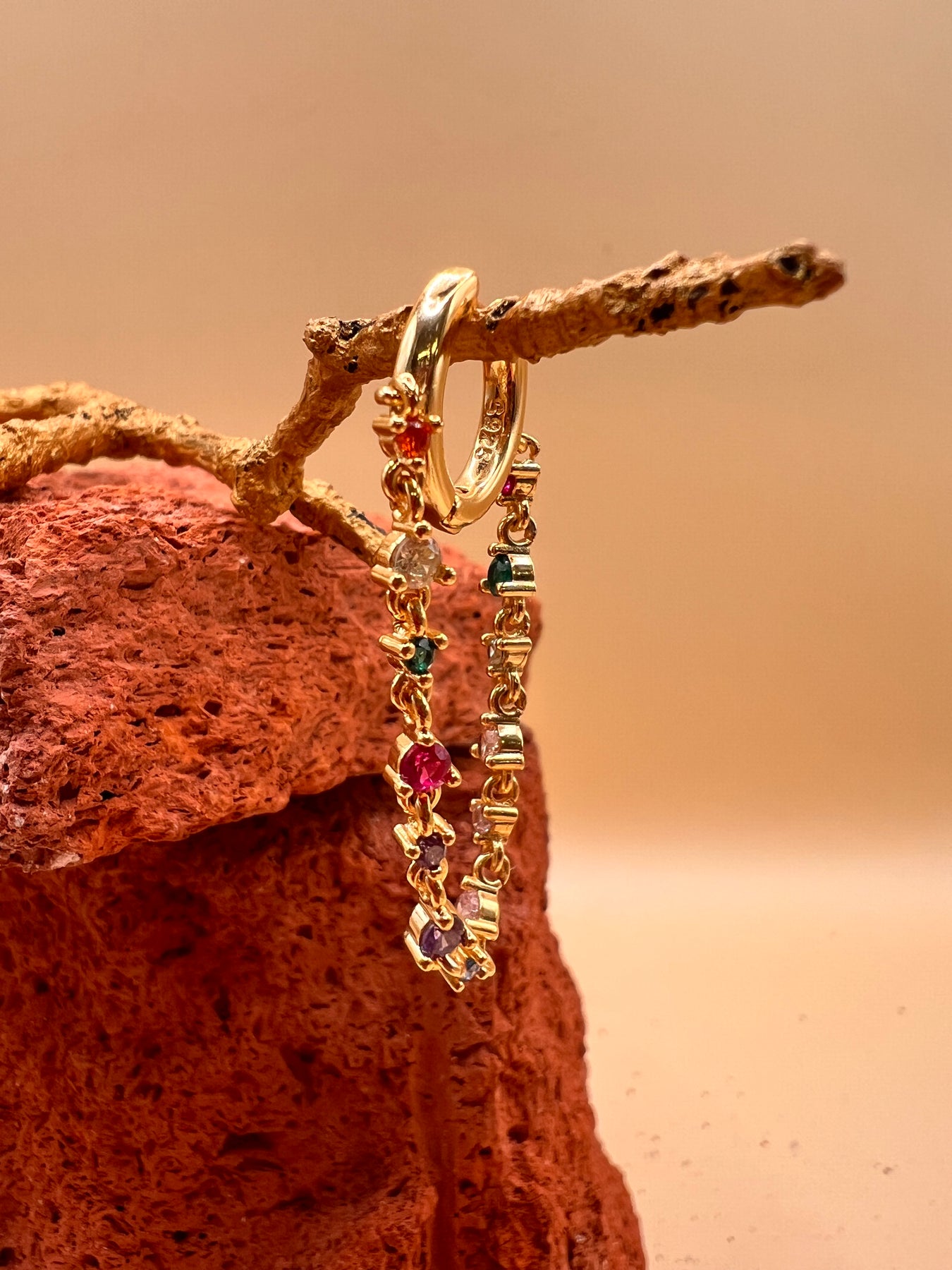 Minimal Rainbow Zircon Hoop Earring – 12mm Gold Plated Silver | One Piercing Crystal Drop | Maralkunst Oslo