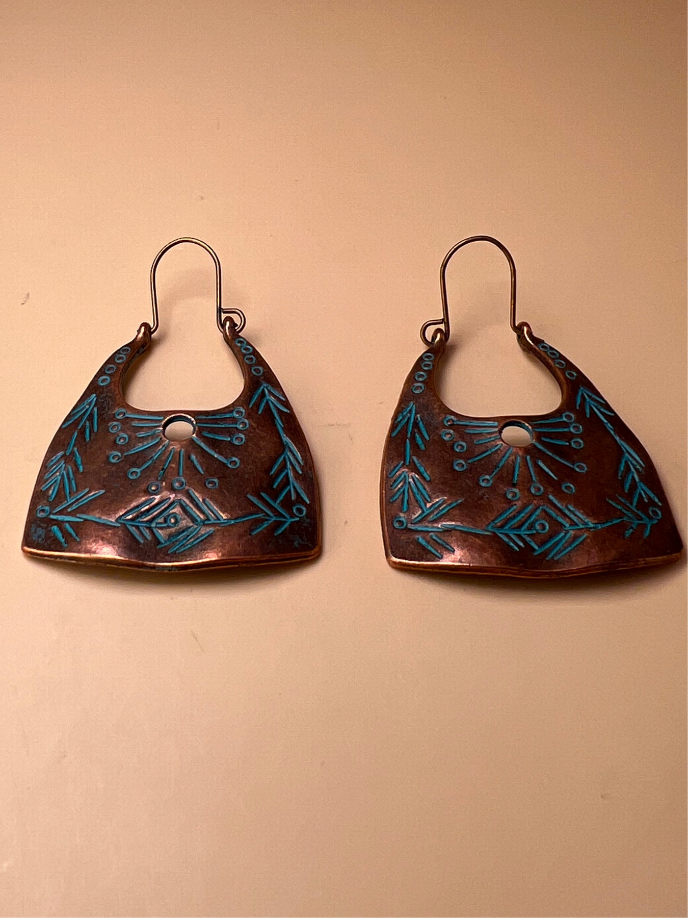 These handcrafted earrings are made from richly patinated copper, engraved with tribal-style motifs in vivid turquoise tones. The open-circle design and etched patterns speak of ancient landscapes, sacred geometry, and stories passed through generations.