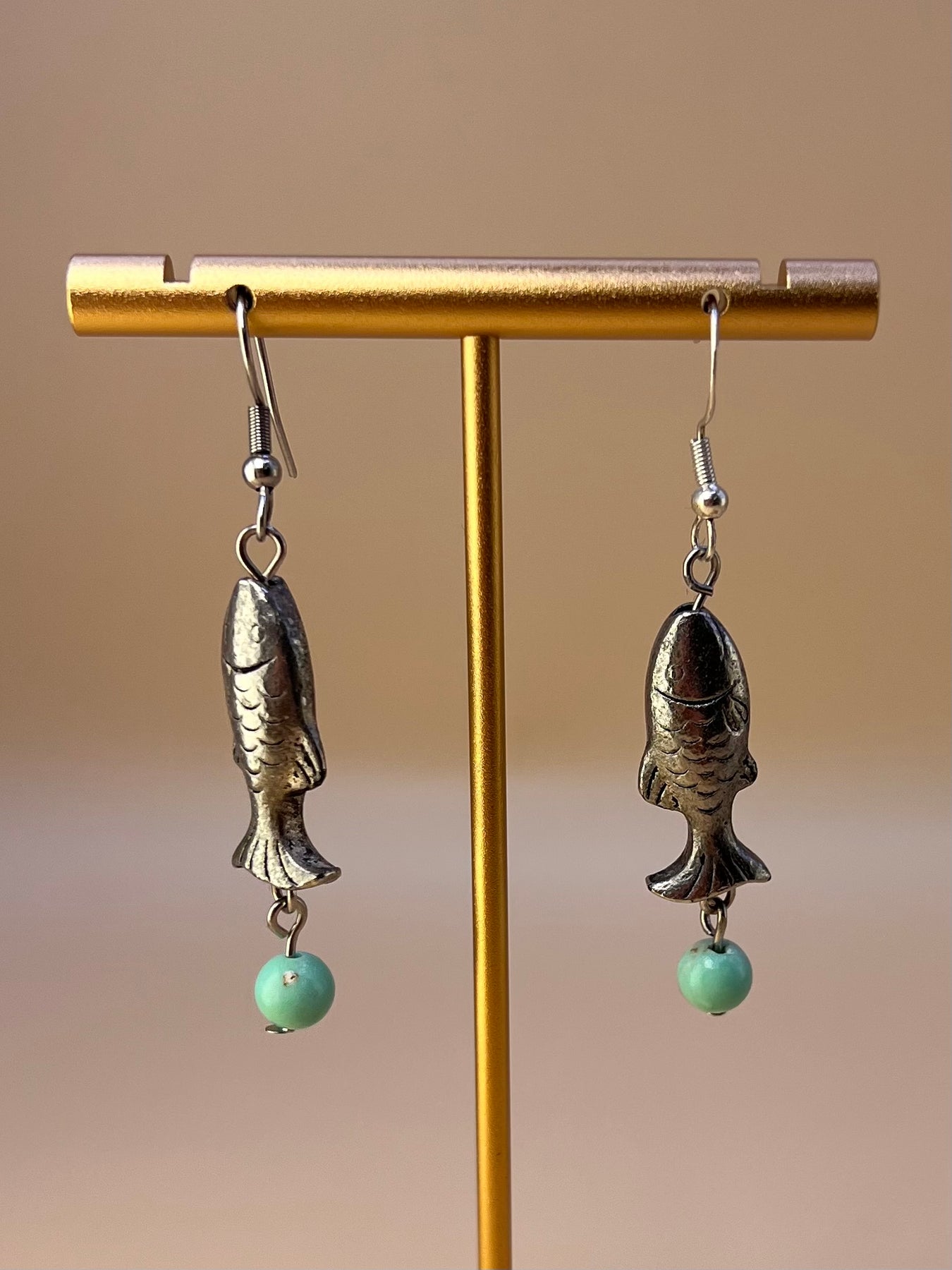 fish earrings, turquoise earrings, silver plated jewelry, symbolic earrings, handmade in Oslo, artisan jewelry, copper fish jewelry, meaningful jewelry, lightweight earrings, maralkunst curated, boho chic earrings, one of a kind earrings