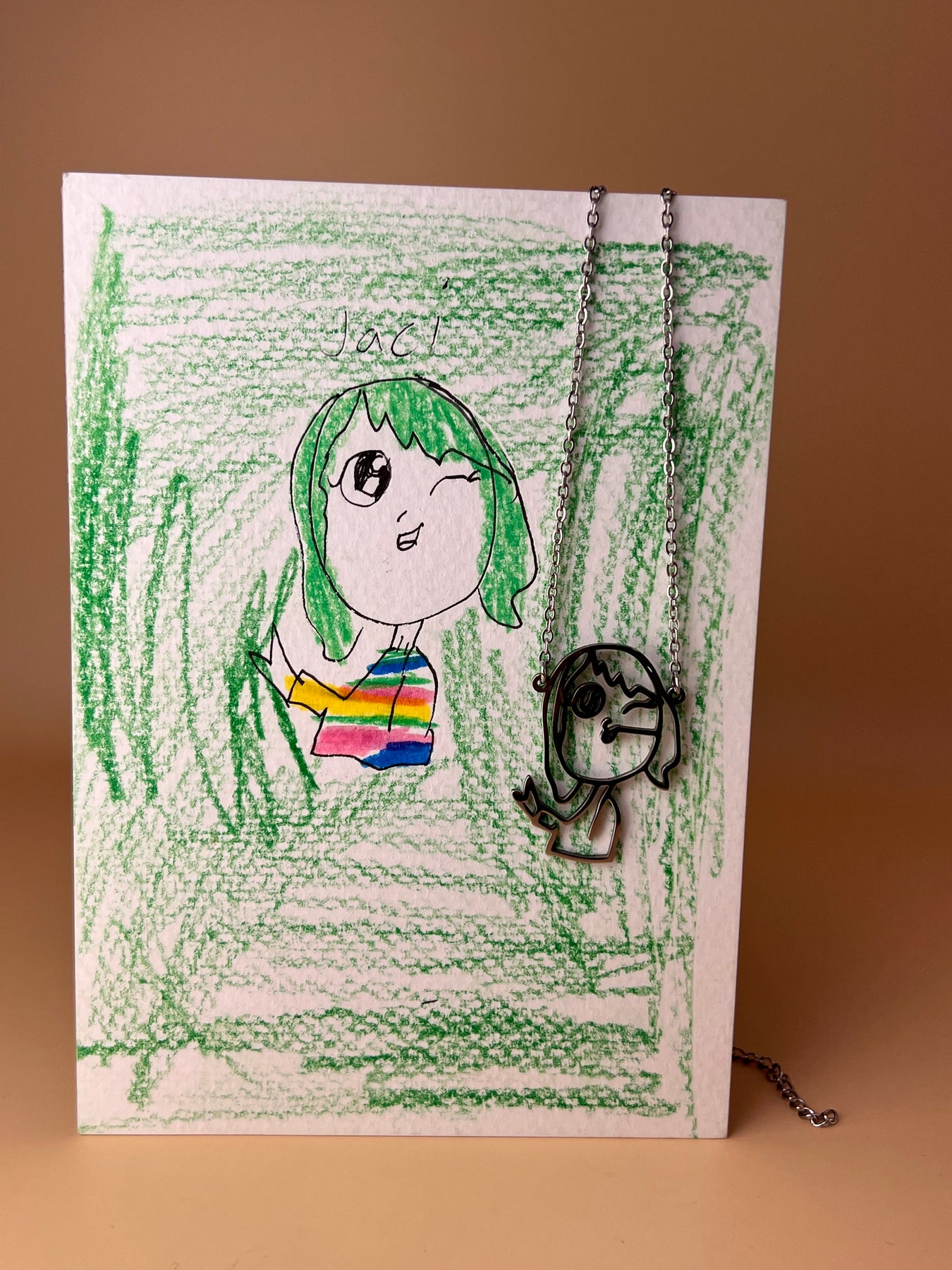 Little Dreamer is a heartfelt necklace handcrafted directly from your kid’s drawing – capturing their unique lines, colors, and joyful spirit in wearable art.