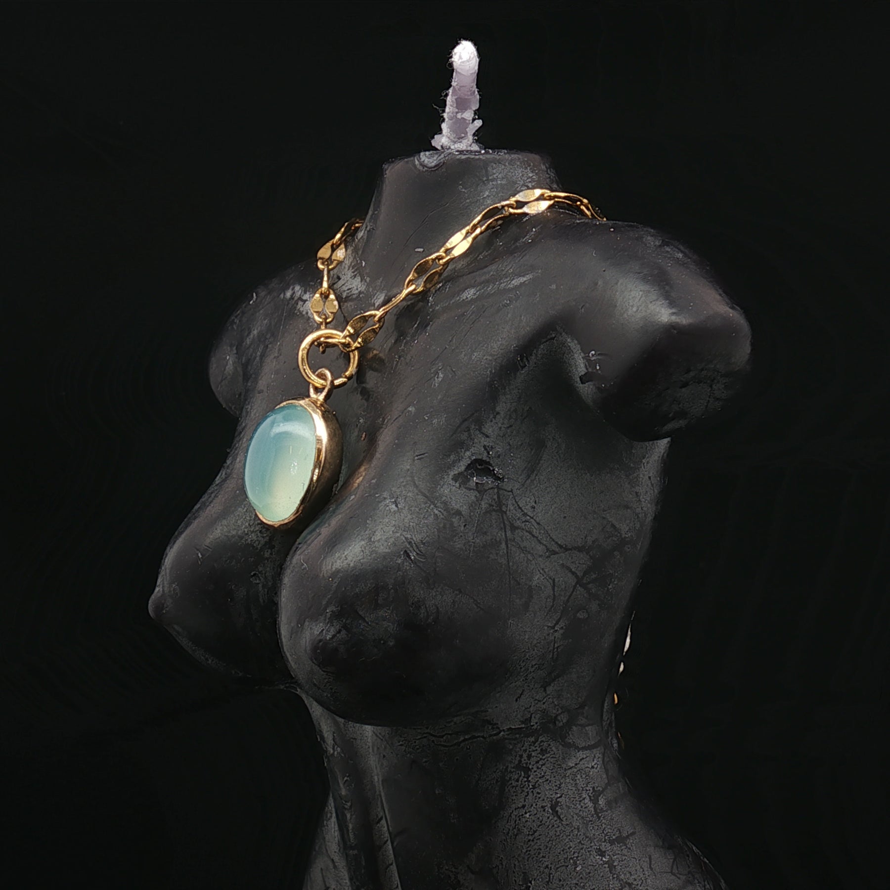 It adds strength, boldness, and a contemporary touch to the soft aquamarine pendant.