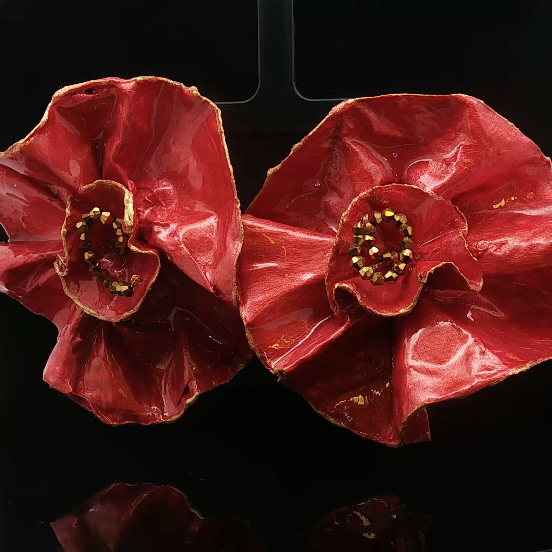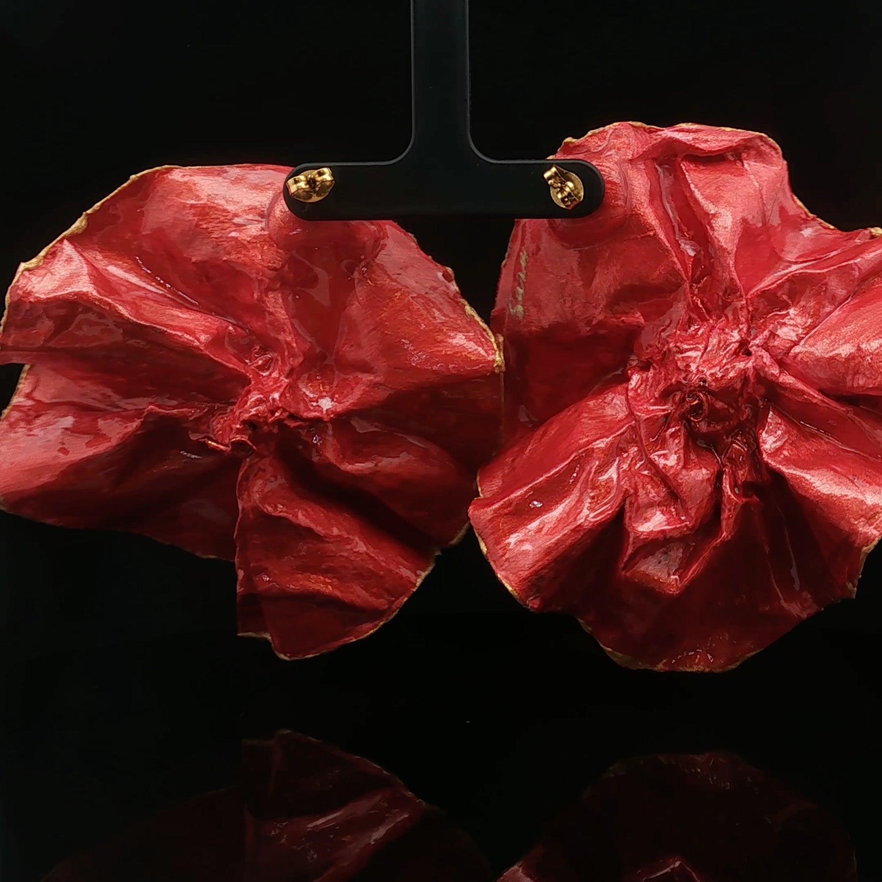 Each earring is sculpted by hand from recycled paper, then delicately painted in deep scarlet tones — symbolizing strength, vitality, and creative fire.
