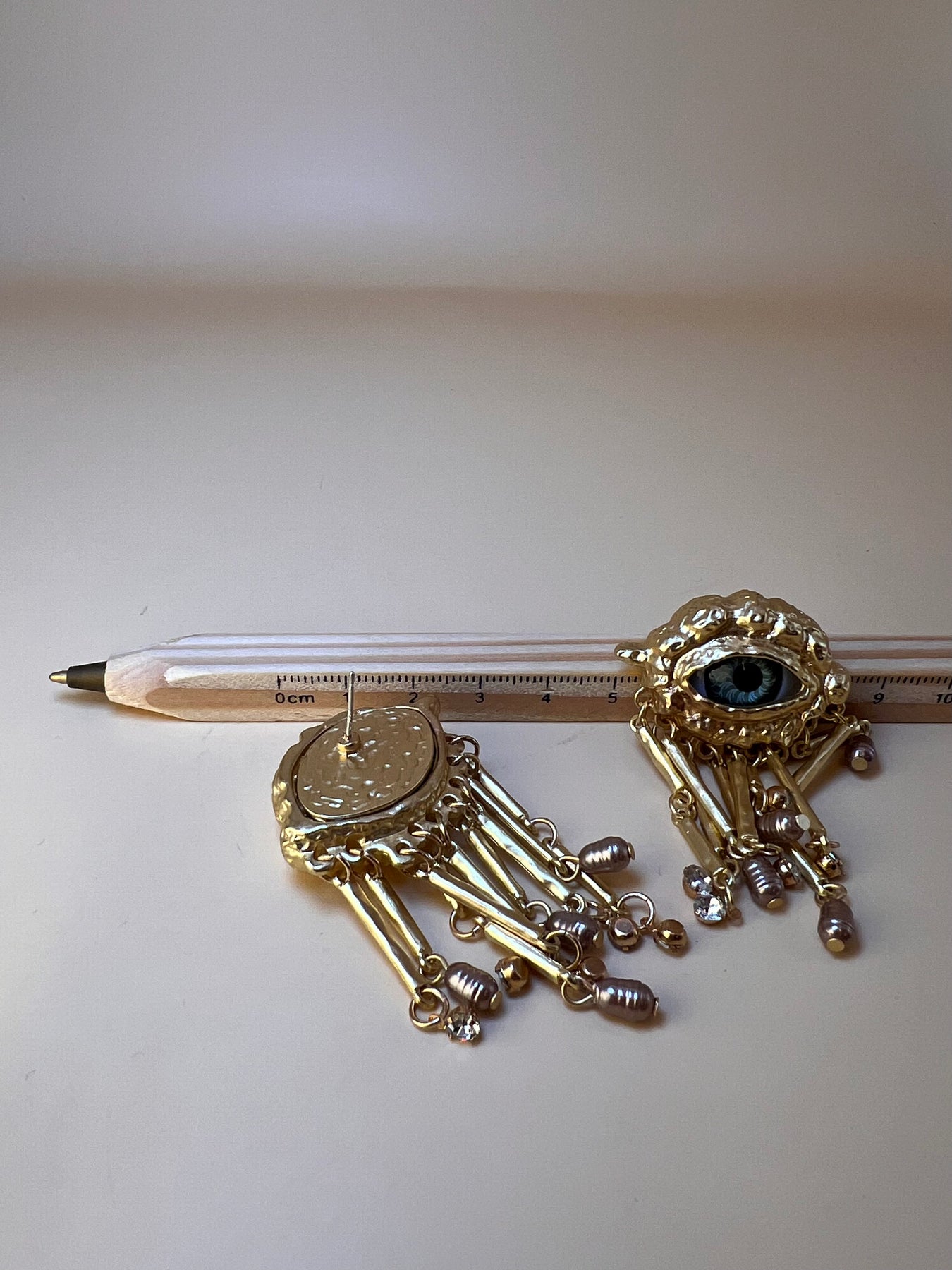 oracle jewelry, evil eye earrings, statement earrings, gold plated copper earrings, handmade in Istanbul, mystical jewelry, protective amulet, freshwater pearl earrings, symbolic jewelry, wearable art, maralkunst curated