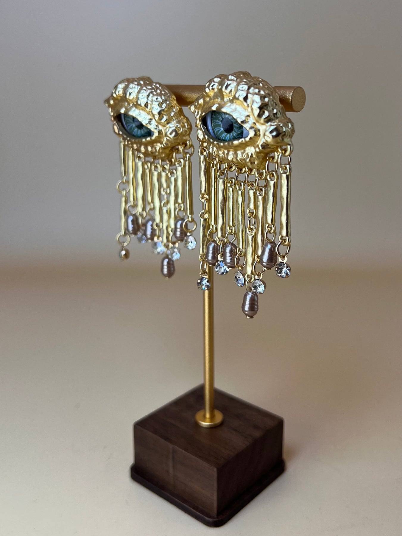 Hand-sculpted in Istanbul, these statement earrings blend ancient mysticism with modern art. Each eye—cast in gold-plated copper—honors the oracle: the mythic guide sought for inner truth and divine insight. Dark freshwater pearls and crystal drops cascade like sacred tears, transforming emotion into elegance. Lightweight yet powerful, they protect, illuminate, and tell your story in a single, unforgettable glance.