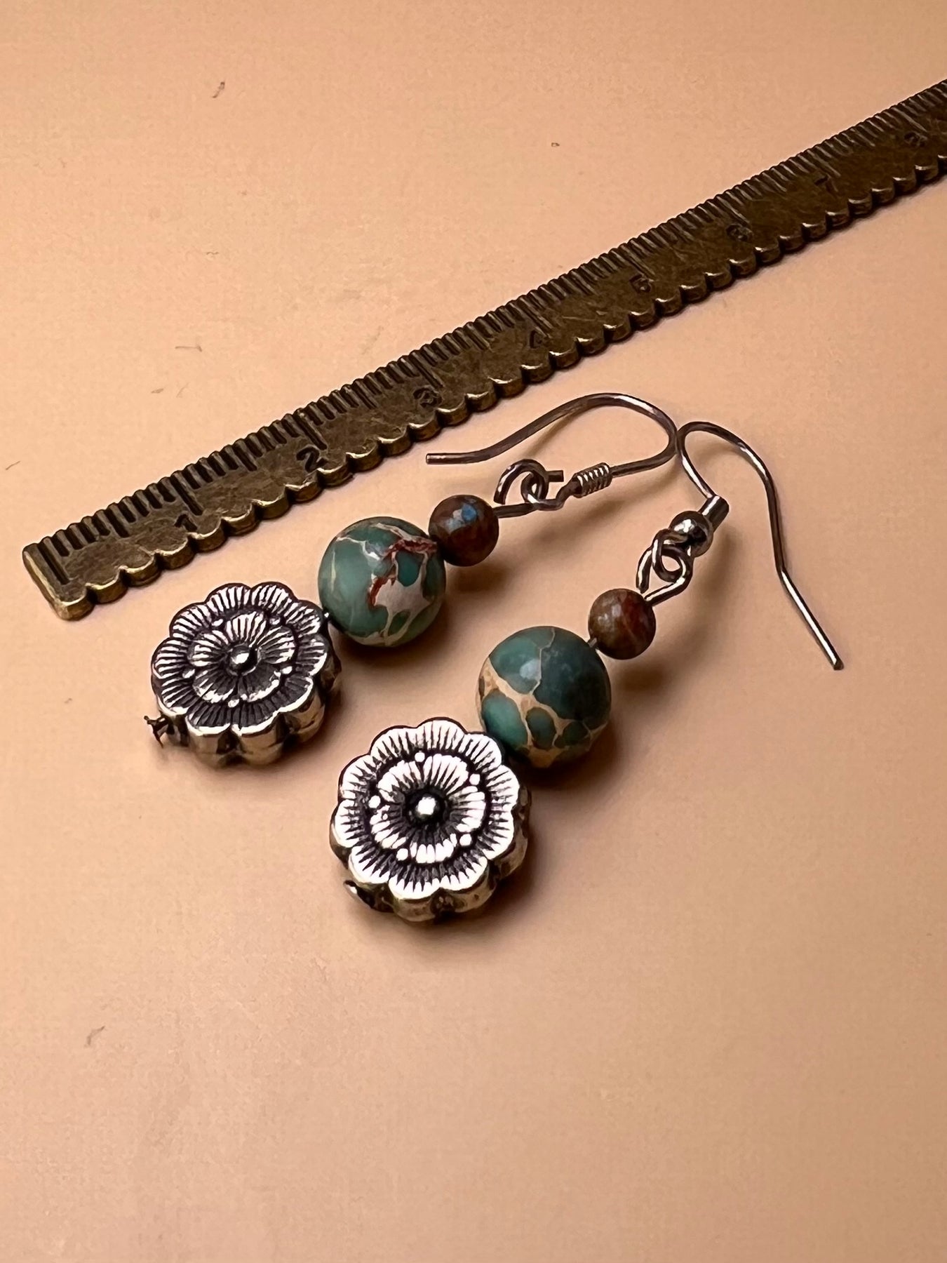 Handmade by Maral, these one-of-a-kind earrings feature genuine African turquoise gemstones and intricate floral silver-plated copper charms. Earthy, poetic, and full of soul, crafted to remind you of your growth, power, and beauty.