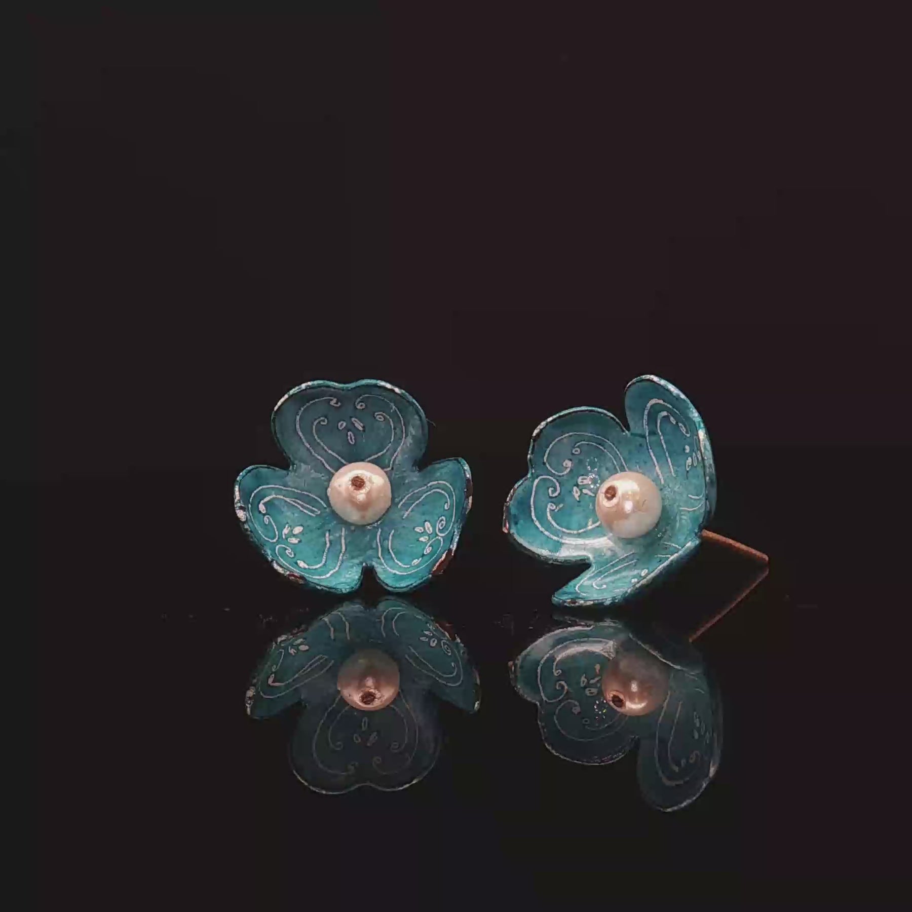 Each petal is shaped by hand on copper, painted with delicate enamel patterns, and crowned with a soft pearl that reflects purity and light.