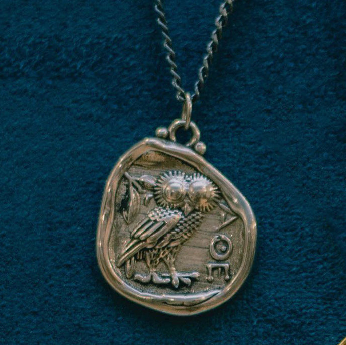 Vintage style goldplated framed 925 silver owl greek coin necklace